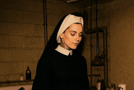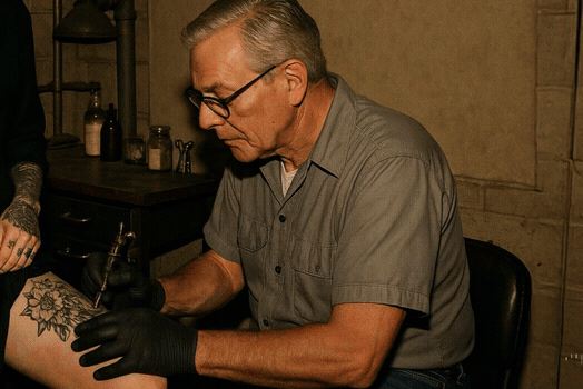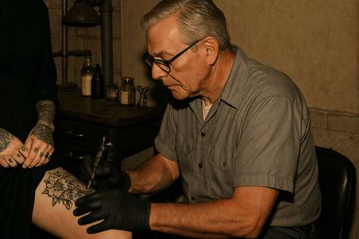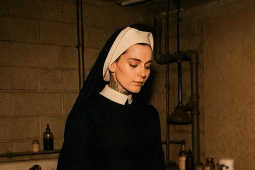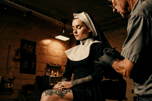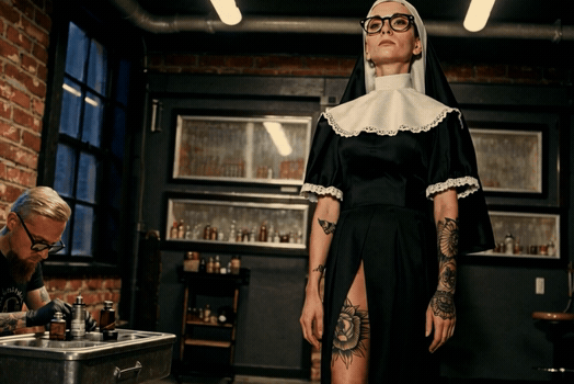 A stylized, retro-inspired scene of a woman in 1980s-era formal attire reminiscent of a traditional habit, receiving a leg tattoo in a vintage basement tattoo studio. Her outfit is modified fashion,modest yet edgy,with long sleeves and high collar, revealing tattooed arms and neck. She stands calmly with a composed, focused expression as a mature, silver-haired tattoo artist works on her thigh. He is seated, wearing a worn short-sleeve work shirt, jeans, glasses, and gloves. The room features classic tattoo shop elements: metal sink, vintage tools, glass jars, and industrial plumbing. Lighting mimics 1950s on-camera flash: strong directional light, sharp shadows, flat backdrop, and slight film grain. The image captures a candid, artistic moment, blending counterculture and mid-century aesthetics. Muted warm tones, beige textured studio backdrop, medium-frame shot, photorealistic finish, 8k detail, hyper-realistic, spotlight.